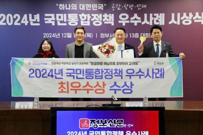 한편, 해남군은 올 한해 지금까지 각 분야별 기관평가에서 108건을 수상하며 역대 최고 성적을 거두고 있는 가운데 이번 국민대통합위원회 최우수상 수상까지 획득하면서 민선8기 주요 역점 정책들에 대한 성과를 대내외적으로 인정받는 계기가 되고 있다.