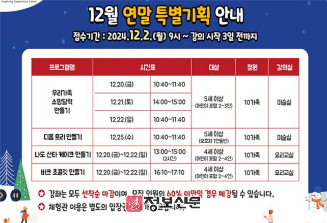 어린이창의체험관은 가족 단위 대상으로 어린이의 상상력을 자극하고 창의력을 키울 수 있는 요리·창작 등 다양한 체험교육 프로그램을 운영할 예정이며, 특히 연말을 주제로 ▲2025년 달력 만들기 ▲디폼트리 만들기 ▲나도 산타 케이크 만들기 ▲바크초콜릿 만들기 등 프로그램으로 구성했다.