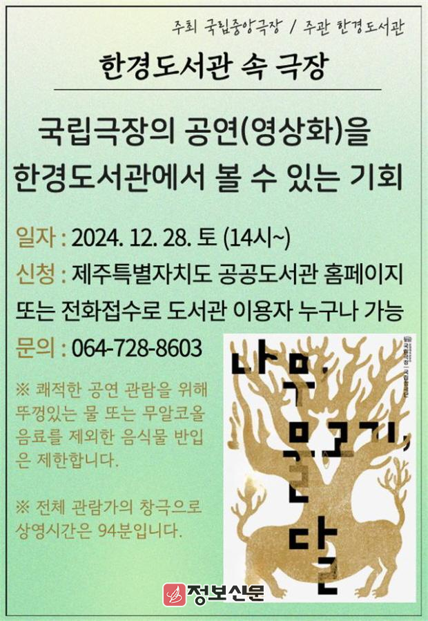상영작은 「나무, 물고기, 달」로 현대인의 마음을 따뜻하게 감싸 안는 동화 같은 창극이며, 12월 28일(토) 오후 2시부터 한경도서관 다목적실에서 운영된다.