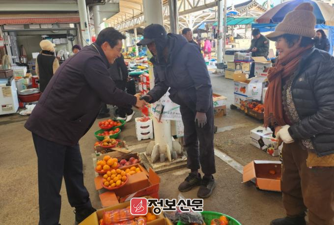 우승희 영암군수는 영암5일시장 각 매장을 돌며 지역민, 상인, 소상공인 등을 만나 경기 회복을 위해 영암군에서 생산된 상품부터 구매해 달라고 당부했다.