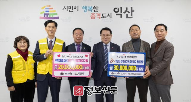 케이티 위즈 관계자는 20일 익산시청을 방문해 지역 야구단과 어려운 이웃을 위해 5,000만 원 상당의 야구용품과 생활용품을 전달했다.