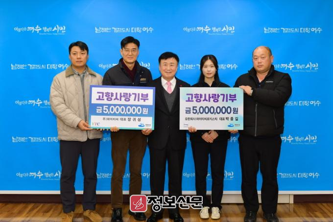 ![]() 여수시(시장 정기명)는 지난 18일 와이티씨 장귀성 대표와 와이티씨로지스틱 박종길 대표로부터 각각 500만 원의 고향사랑기부금을 전달받았다고 밝혔다.