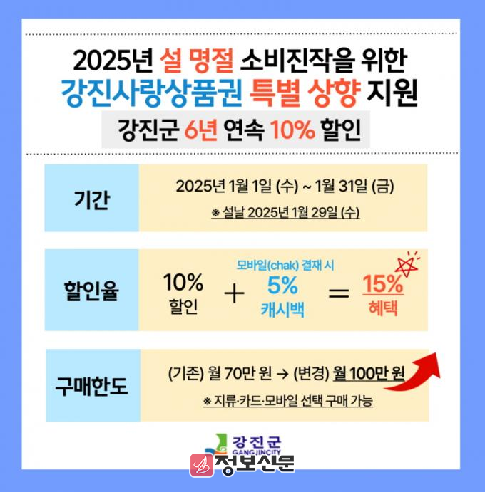 ![]() 강진군, 설 명절 강진사랑상품권 특별할인 상향 조정 |