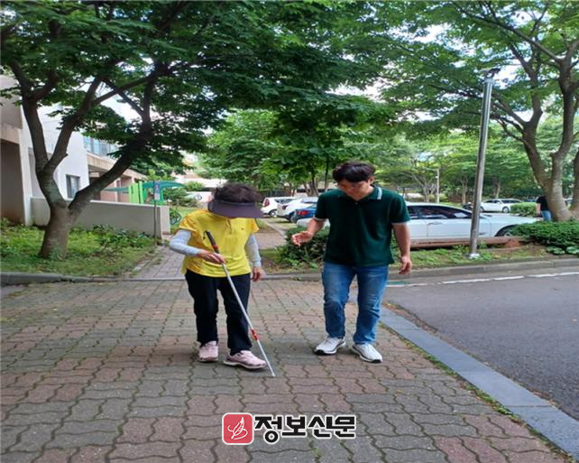 <보행교육>은 개별 상황에 맞춰 집안 또는 집주변 보행교육(실내, 현관, 마당, 복도, 엘리베이터 등), 그리고 자주 이용하는 장소에서 안전사고 근절을 위한 장애물 위치확인 방법, 흰지팡이 사용법 등의 교육으로 진행됐다.