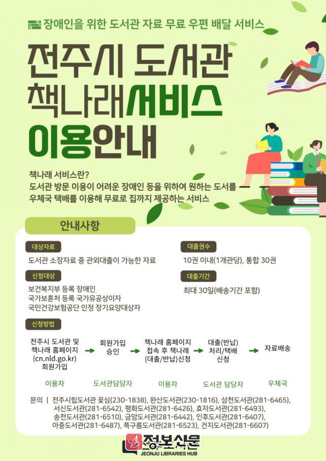 한편, 최현창 전주시 도서관본부장은 “책나래 서비스를 확대 운영해 도서관 방문이 어려운 정보 취약계층의 정보 접근 격차 해소에 앞장서고, 독서 생활화에도 기여할 것”이라며 “앞으로도 전주시는 책의 도시답게 다양한 계층을 위한 정보 서비스를 확대하기 위해 적극 노력하겠다”고 말했다.