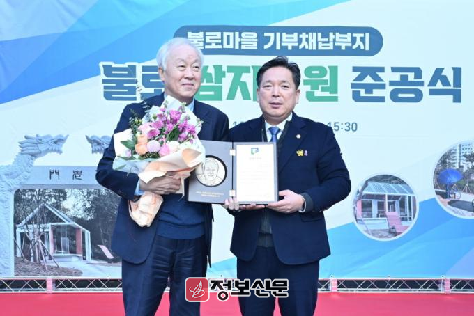 이 회장은 봉선동 한국아델리움 1단지 아파트 뒤편에 들어선 쌈지공원 조성터의 토지 소유자로, 사회 환원 차원에서 지난 2023년 6월에 450㎡ 가량의 땅을 구청에 기부했다.