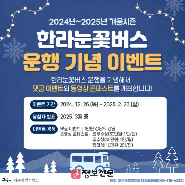![]() 제주특별자치도, 한라눈꽃버스 운행 기념 댓글 이벤트 및 동영상 콘테스트 개최 |