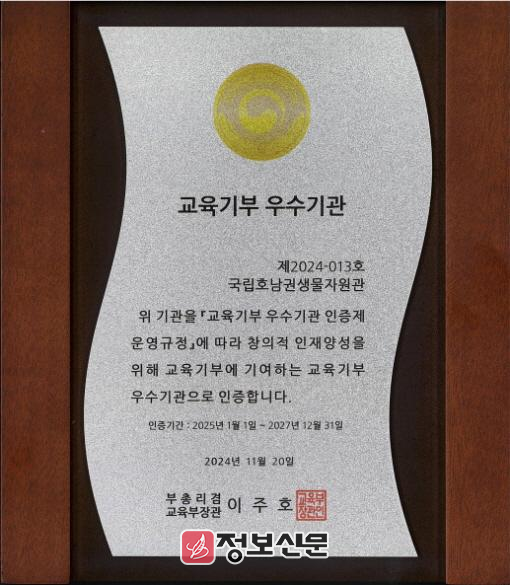 ![]() 국립호남권생물자원관, 교육기부 우수기관 인증 |