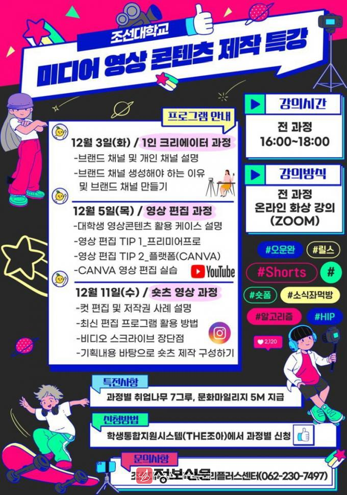 조선대 대학일자리플러스센터는 지난 3일부터 11일까지 3회에 걸쳐 1인 크리에이터 특강, 영상 편집 과정, 숏츠 영상 과정에 대해 특강을 진행했다고 전했다. 이번 특강은 문화콘텐츠 분야에 대한 역량을 강화하고, 미래 미디어 트렌드를 배우면서 학생들이 영상 및 미디어 프로그램을 효과적으로 다루는 방법을 습득할 수 있도록 설계됐다.