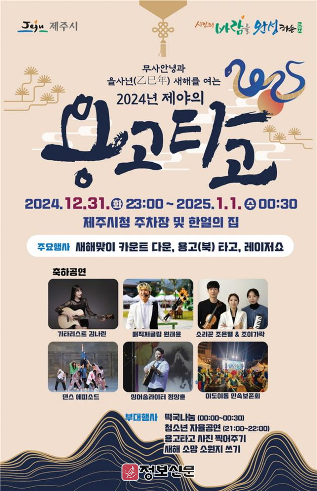 이날 행사는 밤 11시부터 문화공연, 시민 새해 소망 영상 송출, 제주시장 신년 메시지, 카운트다운, 용고타고 순으로 진행된다.