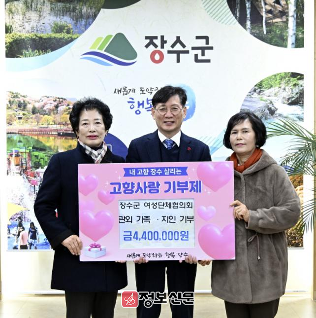장수군 여성단체협의회 13명의 회원들은 작년에 이어 올해도 고향사랑기부제에 적극 동참할 수 있도록 홍보하며 관외에 거주하고 있는 가족과 지인들에게 고향 발전에 기여할 수 있도록 독려해 기부금 440만원을 기탁했다.