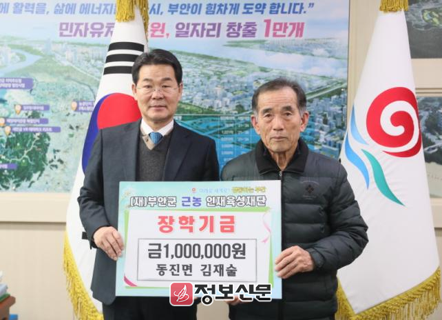 부안 동진면 운학 김재술님은 부안군 근농인재육성재단을 방문하여 지역 인재육성을 위한 장학금 100만원을 기탁했다.
