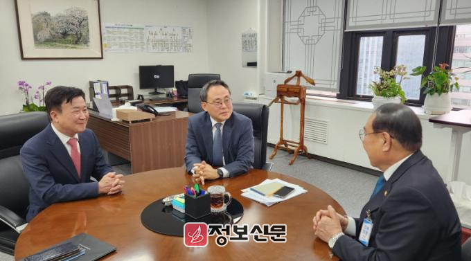 ![]() 정기명 여수시장이 지난 4월 24일 고기동 행정안전부 차관을 만나 섬박람회 특별교부세 사업에 대해 설명하고 있다. |