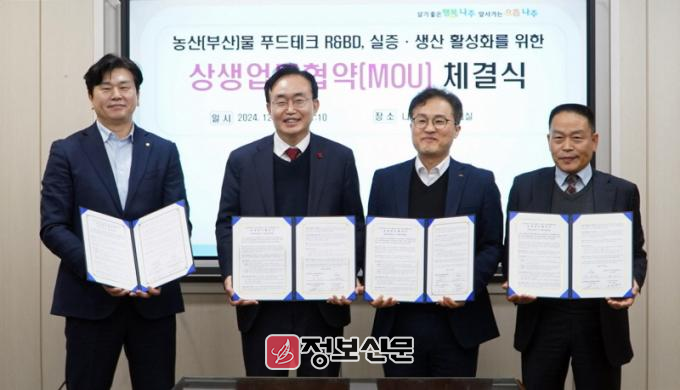 나주시(시장 윤병태)는 지난 26일 농협경제지주 농협식품R&D연구소(소장 강대익), 광동제약(주) 천연물융합연구개발본부(본부장 박일범), 전라남도 농업기술원과 ‘푸드테크 연구개발 및 실증·생산 활성화를 위한 업무협약’을 체결했다고 27일 밝혔다.
