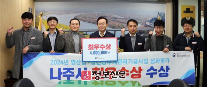 ![]() 나주시가 2023회계연도 영산강·섬진강수계관리기금 지원사업 성과평가에서 환경기초시설 설치 분야 ‘최우수기관’으로 선정됐다. 윤병태 시장과 상하수도과 직원들이 기념촬영을 하고 있다. (사진제공-나주시)