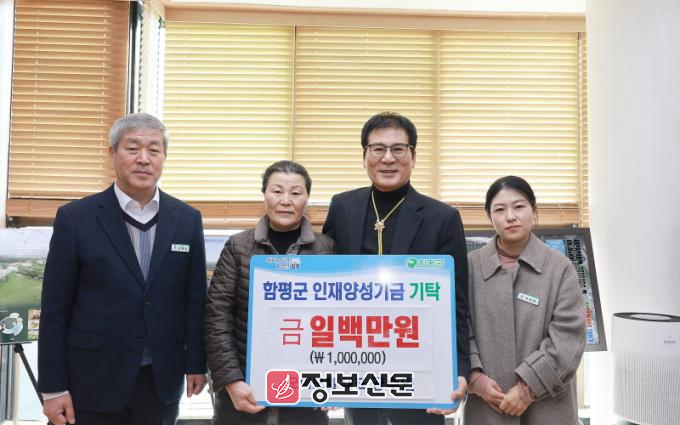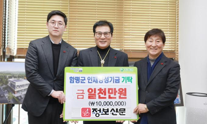 이번 기탁은 ▲모아모텔(대표 공수인) 100만 원 ▲천지환경(주)(대표 최성규) 1,000만 원으로, 총 1,100만 원의 인재양성기금이 27일 함평군에 전달됐다.