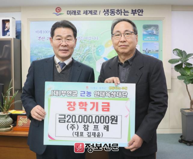 ![]() ㈜참프레, 부안군 근농인재육성장학금 2000만원 기탁 |