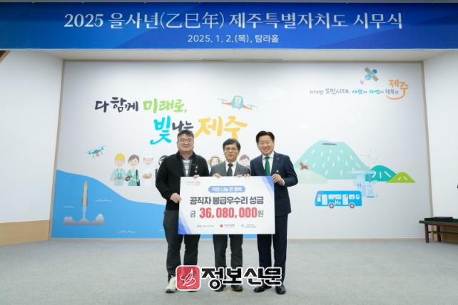 오영훈 지사와 도 공무원노동조합 오태권 위원장은 직원들의 모금으로 마련된 봉급우수리 성금 3,608만 원을 2일 오전 도청 탐라홀에서 열린 ‘’25년 제주도청 시무식’에서 제주 사회복지공동모금회(회장 강지언)에 전달했다.