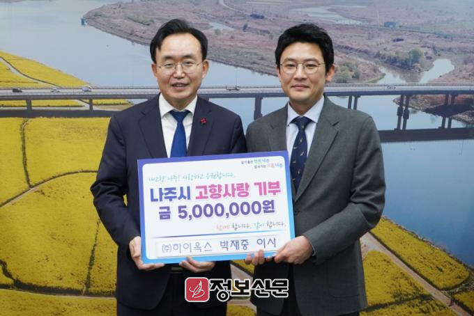 ![]() ㈜하이옥스 박재중 이사가 나주시에 고향사랑기부금 500만원을 기탁했다. (사진제공-나주시)