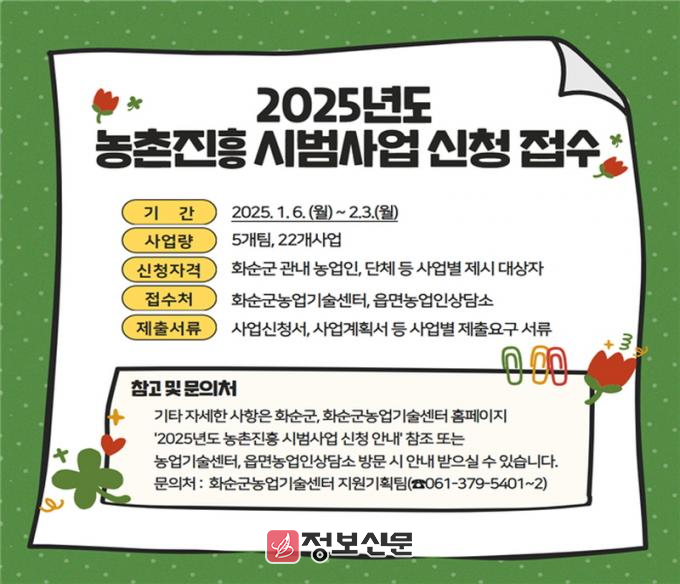 ![]() 화순군, 2025년 농촌진흥 시범사업 신청·접수 |