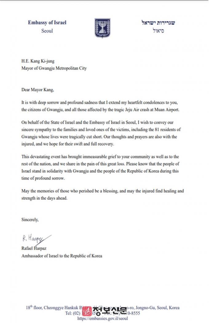 지난해 부임해 광주시를 방문한 라파엘 하르파즈 주한이스라엘대사도 서한문을 보내왔다. 라파엘 대사는 “비극적인 사건은 광주 뿐만 아니라 대한민국 전체에 측량할 수 없는 슬픔을 안겨주었고, 저희 또한 깊은 상실의 아픔에 함께 느낀다”며 “이 어려운 시기에 이스라엘 국민이 광주와 대한민국 국민과 함께한다는 사실을 기억해 주기 바란다”고 전했다.