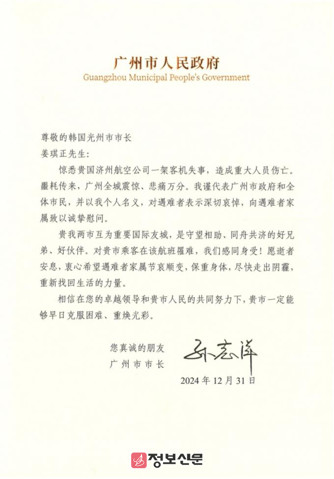 광주시 자매도시인 광저우시(시장 쑨즈양)와 창즈시(시장 천샹양), 우호도시 다롄시(시장 청사오왕), 원저우시(시장 장원제), 취안저우시, 칭다오시(시장 자오하오즈) 업무협정(MOU)도시 옌청시(시장 장밍캉) 등 중국 7개 지방정부에서도 깊은 위로와 애도를 표하는 서한문을 보내왔다.