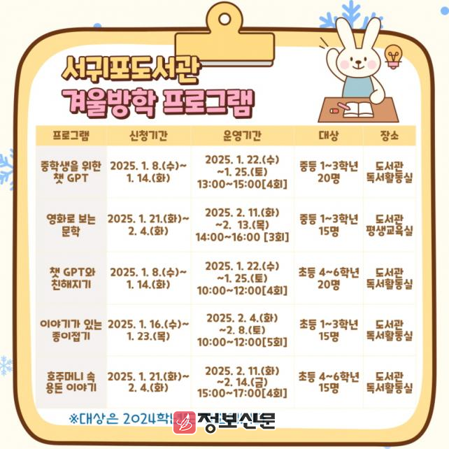 ![]() 서귀포도서관, 겨울방학 프로그램 참여자 모집 |