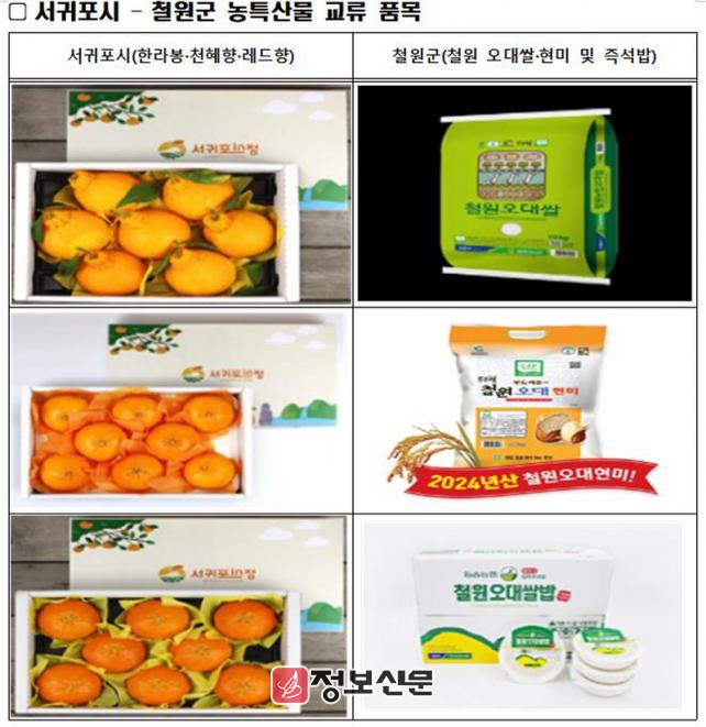 서귀포시는 이번 교류 품목으로‘서귀포in정’에서 엄선한 겨울 제철 만감류 한라봉, 레드향, 천혜향을, 철원군은 강원도지사 인증 농수특산물인 철원 오대쌀(햅쌀) 및 간편식 즉석밥과 함께 최근 잡곡밥을 선호하는 트렌드를 반영해 철원 오대현미를 추가 선정하였다.