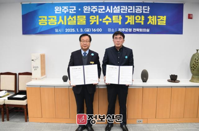 이날 체결식은 유희태 완주군수와 소관업무 부서장, 이희수 완주군시설관리공단 이사장과 공단 팀장 등 10여 명이 참석한 가운데 이뤄졌으며, 완주군시설관리공단의 2025년 경영목표 및 사업계획 공유에 이어 상호 위수탁 협약서를 교환했다.