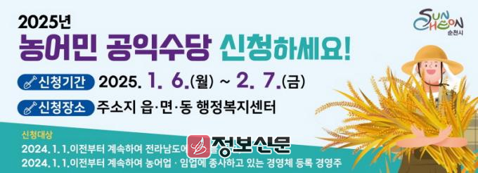 ![]() 순천시, ‘2025년 농어민 공익수당’ 신청 접수 |