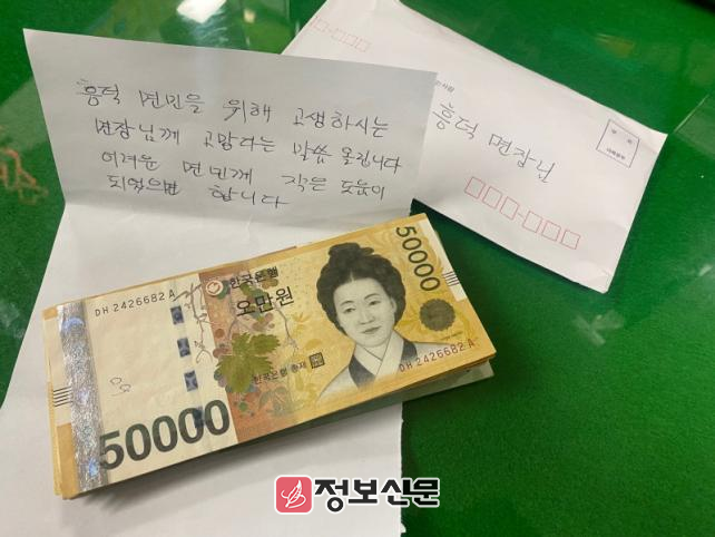 편지에는 “흥덕 면민을 위해 고생하시는 면장님께 고맙다는 말씀올립니다. 어려운 면민께 작은 도움이 되었으면 합니다.”라는 짧은 메시지가 적혀 있었다. 흥덕면장은 이번 기부금을 어려운 이웃을 돕는데 사용할 계획이라고 밝혔다.