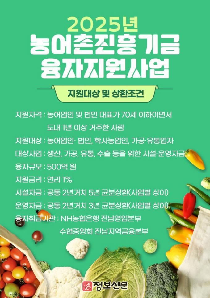 지원 대상은 전남에 주소를 둔 농어업인이나 전남에 주된 사무소를 둔 농어업법인이다. 개인은 1억 원(학사농업인 2억 원), 법인은 2억 원(가공·유통회사 10억 원), 저온저장고 설치 자금은 5억 원 한도에서 1% 이자로 융자 지원한다.