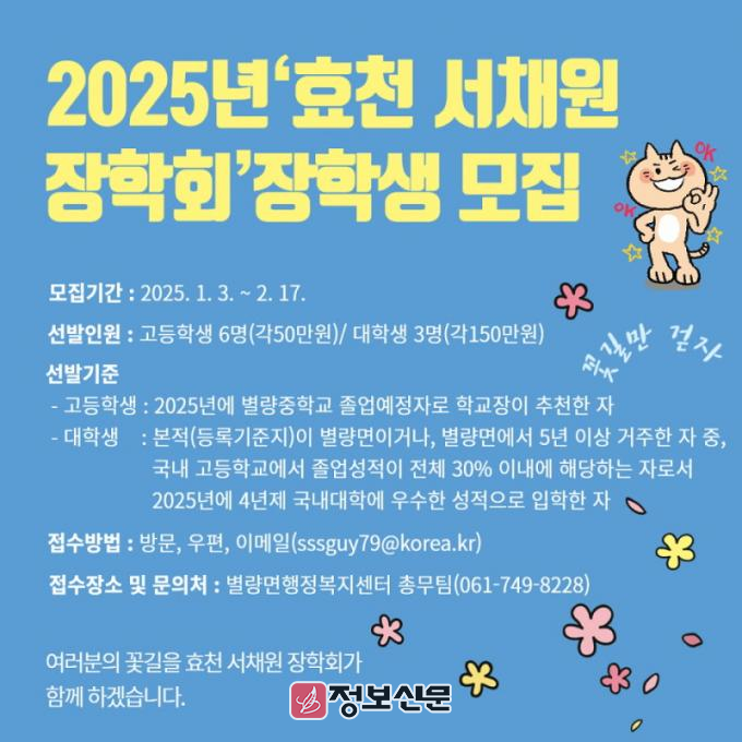 ![]() 순천시 별량면 효천 서채원 장학회, 2025년도 장학생 선발 |