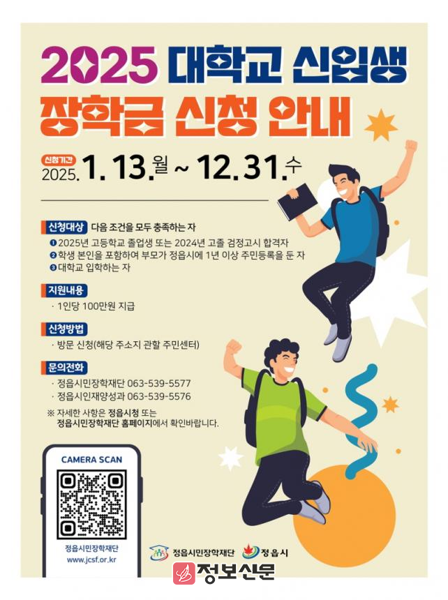 ![]() 정읍시민장학재단, 대학교 신입생에 장학금 100만원 지원 |
