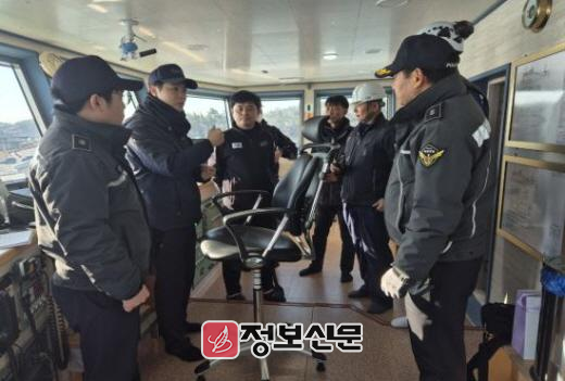 ![]() 관계기관 합동으로 25년 1월 8일 목포관내 가룡항에서 설 연휴대비 특별점검을 위해 브리핑을 실시하고 있는 모습 |