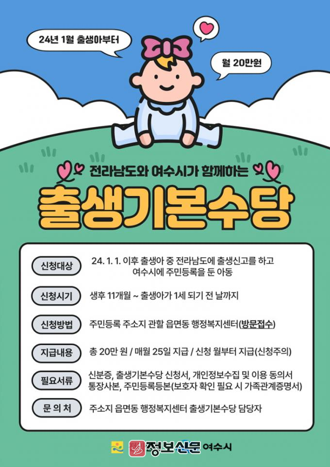 ![]() 여수시, 올해부터 출생기본수당 월 20만 원 지급 |