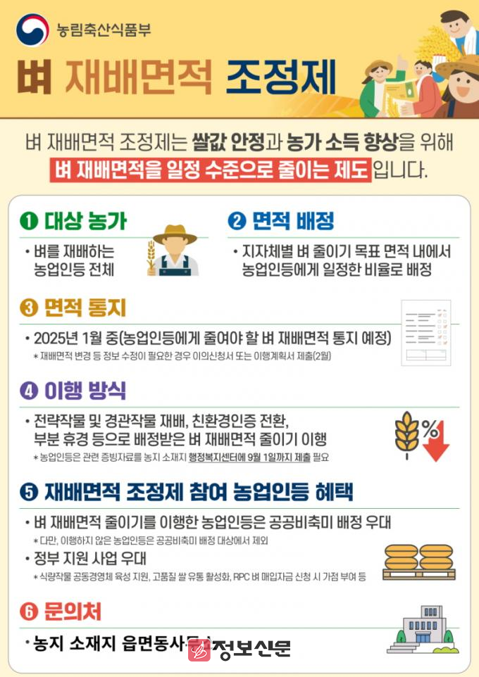 재배면적을 줄이는 농가에는 공공비축미 매입량 배정 우대, 고품질 쌀 유통 활성화, 미곡종합처리장(RPC) 벼 매입자금 신청 시 우대 등의 실질적인 혜택을 제공한다.