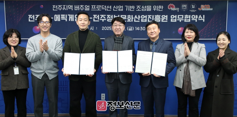전주시와 에픽게임즈는 10일 시청 3층 회의실에서 우범기 시장과 에픽게임즈 코리아 박성철 대표, 전주정보문화산업진흥원 허전 원장 등이 참석한 가운데 전주지역의 버추얼 프로덕션 산업 기반 조성 및 전문인력 양성을 위한 업무협약(MOU)을 체결했다.