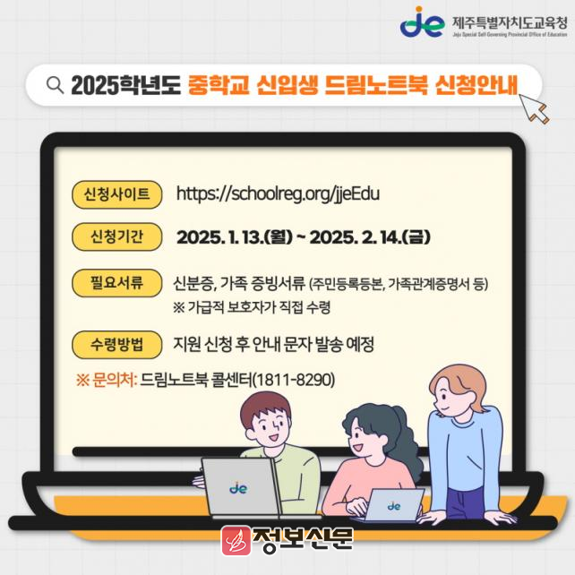 드림노트북 신청은 올해 제주도내 중학교(특수학교 중학교 과정 포함 등)에 입학 예정인 1학년 학생 보호자가 13일부터 다음 달 14일까지 직접 온라인 사이트(https://schoolreg.org/jjeEdu)또는 도교육청 누리집에서 하면 된다.