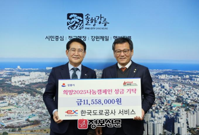 한편, 한국도로공사서비스(사장 오병삼)가 1월 13일 ‘2025년 을사년 맞이 새해 첫 기부’로 강릉시를 찾아 지역 저소득층 아동·청소년을 위한 장학금 1,156만 원을 기부했다. 오병삼 사장(왼쪽)과 김홍규 강릉시장이 기념촬영을 하고 있다.