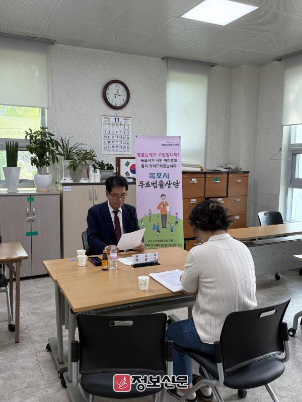 목포시가 운영중인 무료법률상담실은 시간적·경제적 등 이유로 변호사와 법률문제를 상담받지 못하는 시민의 권익구제를 위해 지난 2009년부터 목포시 고문·위촉 변호사(고문4, 위촉3) 7명을 선정해 매월 2회(매월 둘째주, 넷째주 월요일) 동행정복지센터를 순회하며 무료 법률상담을 실시하고 있다.