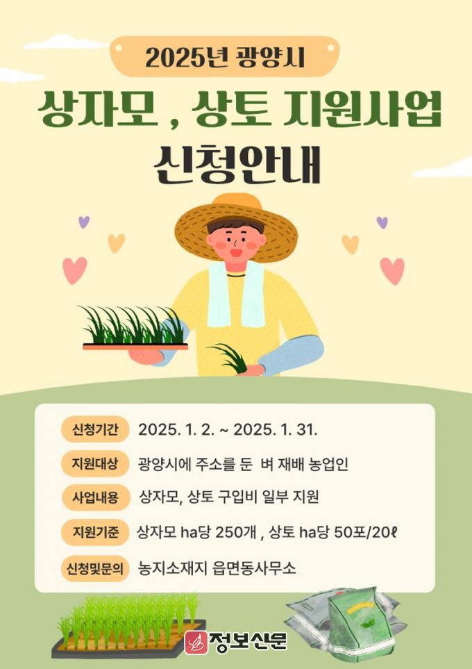 우미자 스마트원예과장은 “고령화 및 인력 부족으로 어려움을 겪는 농가에 상자모와 상토를 지원해 고품질 광양쌀 생산을 돕고 이들의 경제적 부담을 경감 하고자 한다”며 “농가에서는 필요한 영농자재가 적기에 공급될 수 있도록 신청 면적 및 신청 기간 등을 잘 확인한 후 지원사업에 신청하길 바란다”고 당부했다.