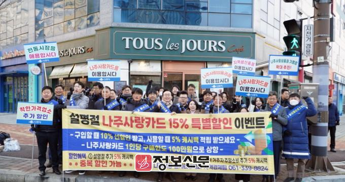 시는 1월 한달간 나주사랑카드 10% 선할인에 5%캐시백을 더한 15%할인혜택과 설 명절 전통시장 10% 페이백, 타지역거주자 주말 소비 이벤트 등을 집중 홍보했다. 또 피켓, 현수막 등을 활용해 나주사랑카드 가맹점 신청과 설 명절 착한가격업소(5% 추가할인), 전통시장을 애용 등 지역경제 활성화를 위한 시민들의 관심과 참여를 독려했다.
