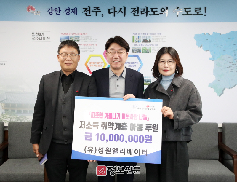 전주시 관계자는 “우리 이웃들에게 관심과 사랑을 갖고 추운 겨울 이웃사랑 나눔에 동참해 주신 (유)성원엘리베이터에 감사드린다”면서 “기탁해준 성금은 지역내 취약계층 아동 지원을 위한 사업에 소중히 사용하겠다”고 말했다.