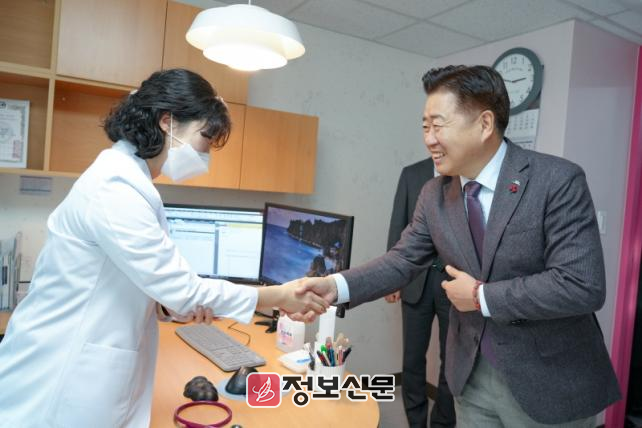 오영훈 제주특별자치도지사는 13일 도내 한 종합병원을 방문해 신규 영입된 소아청소년과 의료진을 격려하고 현장의 목소리를 청취했다.
