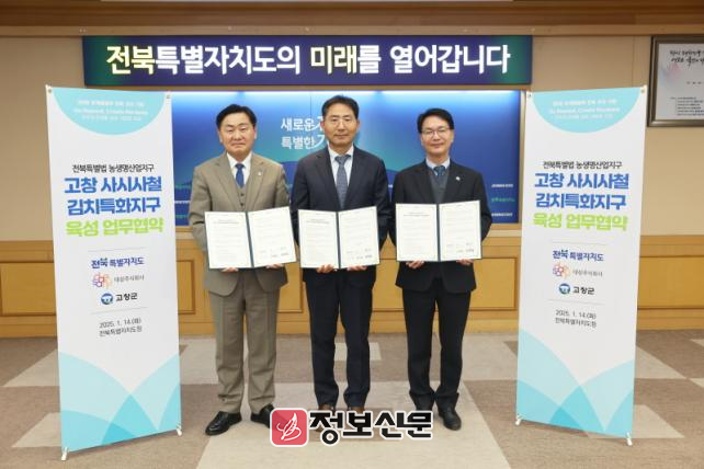 15일 고창군에 따르면 전날(14일) 오후 전북특별자치도청 지사실에서 ‘3개 기관(고창군-전북도·대상) 고창 사시사철 김치특화산업지구 활성화를 위한 상생협력 업무협약식’이 열렸다. 행사에는 심덕섭 고창군수를 비롯해, 김관영 전북특별자치도 도지사와 이정성 대상주식회사 상무가 함께했다.