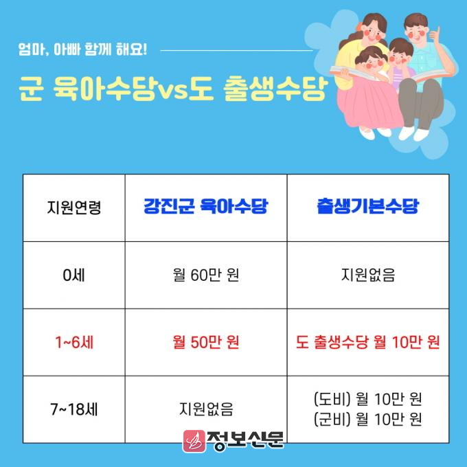 강진군은 기존의 육아수당과 연계하여 만0세는 강진군 육아수당 기존 60만원 지급, 만1~6세는 도 출생수당 10만원(현금)과 강진군 육아수당 50만원 지급, 만7~18세는 도 출생수당 10만원(현금)과 강진군 출생수당 10만원(모바일지역상품권)을 지급한다.