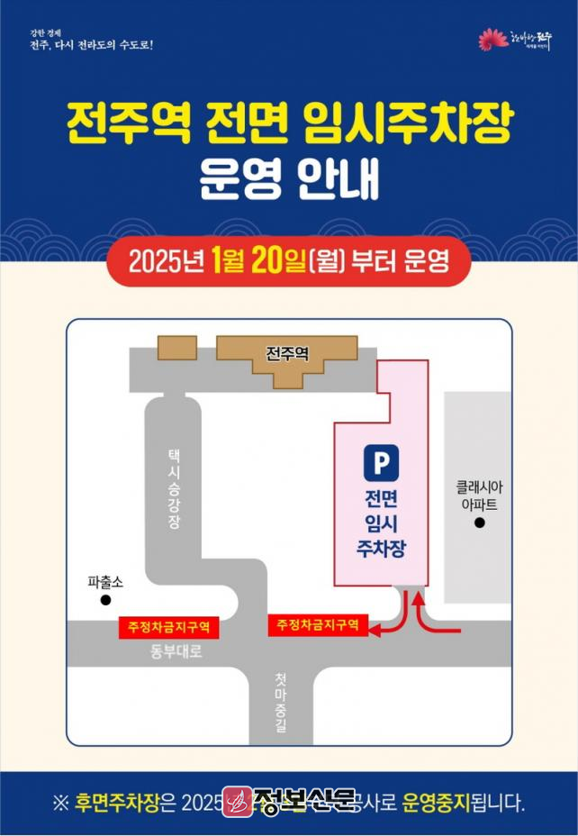 한편, 전주시는 현재 운영 중인 전주역 뒤편(장재마을) 후면 임시주차장에 대해서는 주차타워 조성 공사를 위해 오는 2월 3일부터 운영을 중지할 예정이다