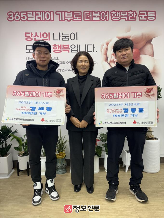 차영숙 군동면장은 “전광열 이장님, 김동훈 대표님, 김세환 대표님의 지속적인 나눔 실천에 깊이 감사드린다”며 “이들의 귀감이 군동면 주민과 기업들에게 큰 울림을 주고 있다. 이번 캠페인이 군동면을 넘어 강진군 전역에 나눔 문화가 확산되길 바란다”고 말했다.