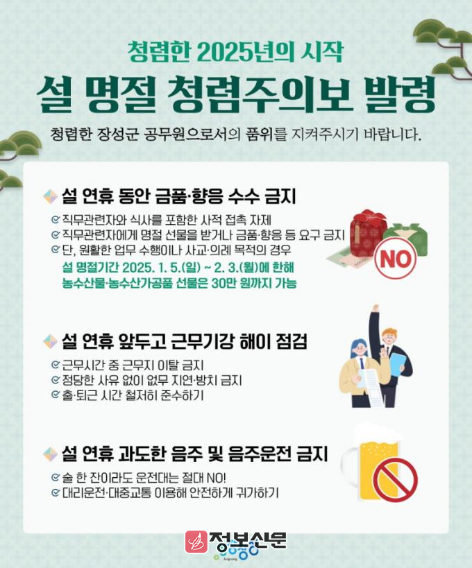 장성군은 청사 전광판 홍보와 함께 민원실 입구에 ‘설 명절 선물 안 주고 안 받기’문구가 적힌 입간판을 세운다. ‘청렴주의보’ 카드뉴스도 제작해 내부 게시판에 게재한다.